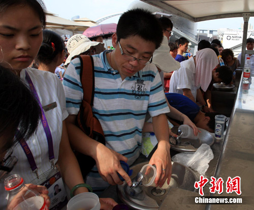 今天下午16:30,記者在西班牙館直飲點前發現,直飲臺被游客圍得水泄不通。記者繞著直飲臺走了一圈,初步統計了一下人數,一個小小直飲臺竟然有105名游客排隊取水。很多游客都是拿著幾個空瓶接水;也有游客接水后,痛快地喝完后又把瓶子裝滿。