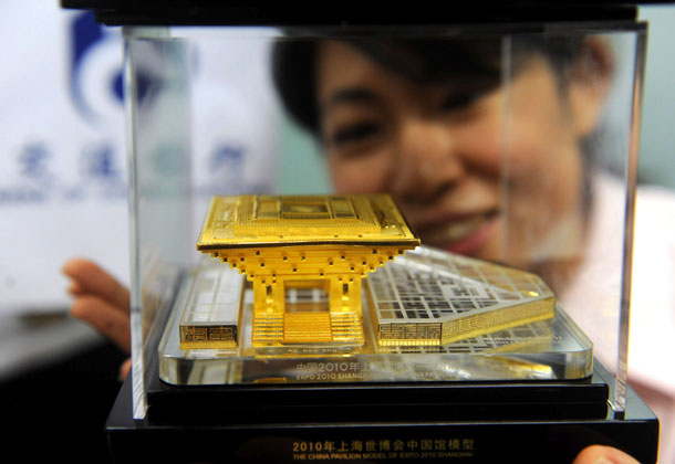 7月7日,在交通銀行北京的一家營業(yè)網(wǎng)點(diǎn),顧客觀看上海世博會中國館純金純銀模型。近日,一款經(jīng)上海世博局授權(quán),中鈔國鼎公司出品的以硬金工藝鑄造的中國館模型在全國各交通銀行上市,受到投資者及收藏者關(guān)注。新華社發(fā)