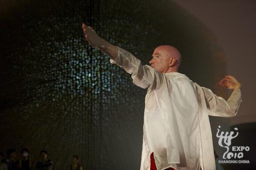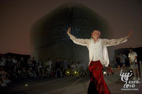 5日晚上,英國藝術(shù)家艾倫·格瑞格(Alan Greig)在“種子圣殿”前展現(xiàn)了精彩絕倫的蘇格蘭現(xiàn)代舞蹈藝術(shù)。艾倫 格瑞格是X Factor舞團(tuán)的藝術(shù)總監(jiān),他的舞蹈作品集運(yùn)動(dòng)、刺激與娛樂性于一體,此次演出片段是根據(jù)他在2009年上海舞蹈節(jié)中首演的獨(dú)舞《Into the Light》改編而成。