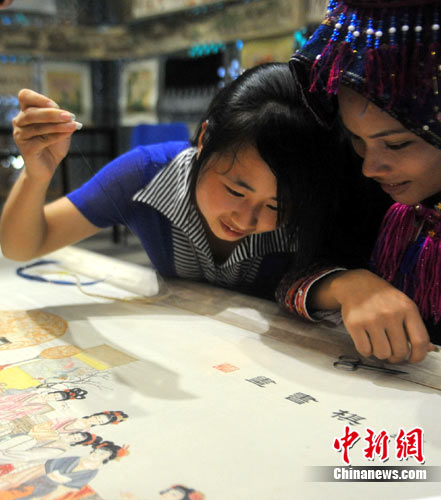 8月10日,上海世博會海南活動周繼續舉行。在寶鋼大舞臺“非遺”傳習區,海南苗妹以少女秀發作線,繡出傳神畫作。據介紹,古時海南苗族人為了躲避戰亂,不斷往山里遷徙。由于在山里無法獲得絲線,愛好紡織的苗族婦女便發明了發繡。發繡藝術歷史悠久,有“無字史書”的美稱,具有極高的文化內涵和欣賞價值。