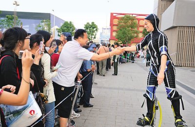 6月2日,由德國館工作人員裝扮的“未來機器人”為游客表演。以緩解游客排隊時的煩悶。新華社記者李俊東攝