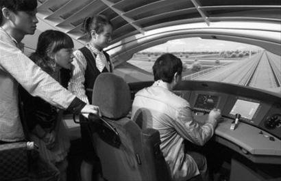 在鐵路館二樓,游客可以對“和諧號”380A的駕駛艙一睹為快。高鐵駕駛艙像一顆子彈頭的前半部分,操作界面相當簡單,而且控制桿比一旁的重型電力機車駕駛室少得多。透過駕駛艙向外看,兩根鐵軌一直在延伸好像沒有盡頭,而兩旁的車站、電線桿、房子等景色栩栩如生。即使列車沒有開動,也能聽到外面有列車呼嘯而過。據介紹,動車組駕駛艙的整體價格超過800萬元。在這里,你可以當一回動車組司機,沿著“京津城際鐵路”風馳電掣地飛奔,也可以駕駛大功率電力機車,在“青藏鐵路”上欣賞雪域高原的天光云影,或者在我國能源大動脈“大秦鐵路”上一路前行感受風光。