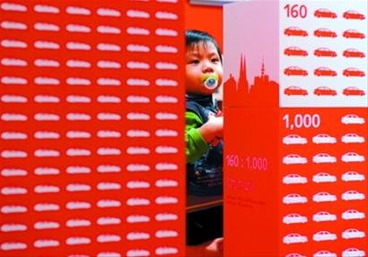 □不來梅館內,一名小觀眾在看通過“拼車”實現“160輛汽車可取代1000輛汽車”功效的展板。新華社圖片