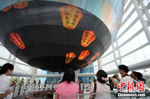 站在用臺灣日月潭的水,花蓮玫瑰石布置而成的點燈水臺前,點擊LED燈上的祈福祝語后隨著天燈冉冉升起,寓意著在上海世博會臺灣館許下的心愿會飄向全世界并實現心愿,成為游客參觀臺灣館行程中最重要的一環。圖為游客紛紛在點燈水臺前許愿