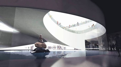 丹麥館名為“夢(mèng)想城市”,將如同一本生動(dòng)的童話書(shū),帶領(lǐng)參觀者親身體驗(yàn)丹麥的城市生活。孩子們可以在廣場(chǎng)上自由自在地玩耍,參觀者可以享用一頓野餐,并讓“海港”的海水輕撫腳趾,而在水中央,還端坐著從丹麥遠(yuǎn)道而來(lái)的貴客——小美人魚(yú)。在這里,參觀者可以選擇步行或自行車兩種不同的速度,由表及里地欣賞丹麥館。蹬上自行車穿梭于這座雙螺旋型的建筑,從地面盤(pán)旋到達(dá)十二米的高度,又盤(pán)旋而下回到地面,掠過(guò)城市的生活,細(xì)細(xì)體味周遭的一切。