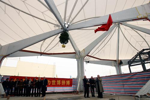 12月2日,在封頂儀式上,一棵松樹被拉升至房梁頂部。當日,上海世博會挪威國家館主體建筑結構封頂儀式舉行。上海世博會挪威館建筑利用挪威領先世界的膠合板技術,以15棵參天大樹的自然形象,構成展館的主體結構。新華社記者 任瓏 攝