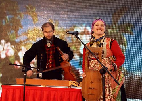 12月2日,兩位挪威音樂家在封頂儀式現場表演挪威傳統音樂。新華社記者 任瓏 攝