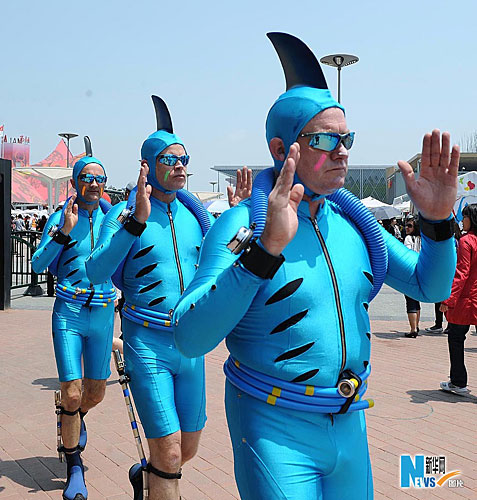 5月1日,幾位工作人員扮成鯊魚在上海世博園澳大利亞館附近的觀眾中“游弋”。當日,上海世博園正式開園