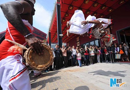 5月1日,上海世博園正式開園,首批持票參觀者接踵而至。這是斯里蘭卡館門口的舞蹈表演吸引眾多參觀者駐足觀看