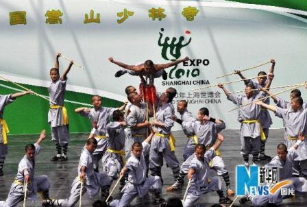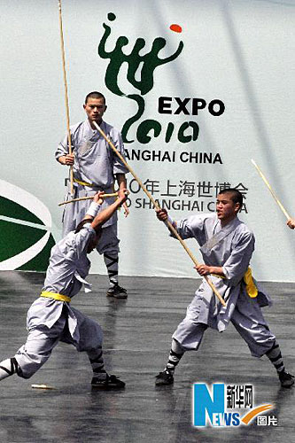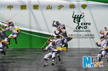 5月1日,少林武僧表演棍術。當日,上海世博園正式開園。來自河南嵩山少林寺的武僧在世博園內為游客展示少林功夫