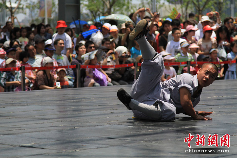 自5月1日開始,上海世博園D片區綜藝廣場每天都有少林寺功夫展演,受到世博參觀者的熱捧。中新社記者 殷春永攝