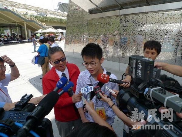 李敖和兒子李戡在臺灣館前接受采訪。(圖片來源:新民網)