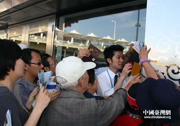參觀完臺灣館的游客簇?fù)碓诔隹谔,讓工作人員在自己的“世博護(hù)照”上蓋上臺灣館的印章。(中國臺灣網(wǎng) 鐘寶華 攝)