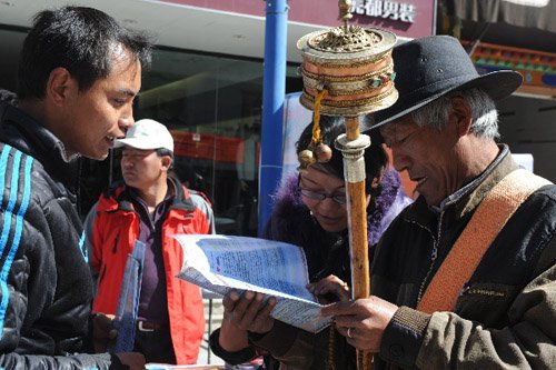 4月3日,拉薩各旅游企業煩人工作人員向市民贈送旅游地圖并做相關講解。(圖片來源:中國西藏新聞網 史雁超 攝)