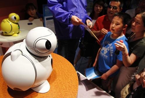 5月19日,小觀眾日本館與一臺(tái)可以與人“對(duì)話(huà)”的機(jī)器人交流互動(dòng)。(新華社記者 裴鑫/攝)