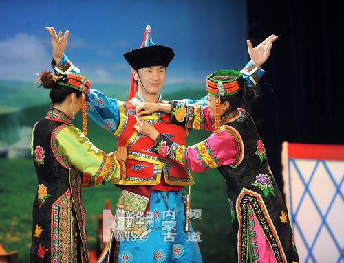 記者:我現(xiàn)在正在位于世博園B區(qū)的寶鋼大舞臺,內(nèi)蒙古的科爾沁婚禮婚俗表演剛剛結(jié)束,悠揚的馬頭琴聲,神秘的呼麥(編者注:“呼麥”是圖瓦文xoomei的中文音譯,原義指“喉嚨”,即為“喉音”,一種藉由喉嚨緊縮而唱出“雙聲”的泛音詠唱技法。呼麥又稱“蒙古喉音”。呼麥作為一種歌詠方法,目前主要流傳于中國內(nèi)蒙古),蒙古舞讓我對蒙古心馳神往,內(nèi)蒙古科爾沁婚禮的婚俗表演是通過歌舞的形式讓我們了解蒙古族的婚俗,蒙古婚禮跟漢族婚禮有一點是一樣的,新郎要去新娘家接新娘回來,在這個過程中蒙古新郎不像漢族新郎那么幸運,必須接受一次次的考驗,比如射箭,因為是游牧民族,而且為了考驗新郎的力氣必須掰羊脖,這個過程當(dāng)中,陪娘們(類似于漢族的伴娘)有一些為了戲弄新郎,找一根紅柳棍或者是一根鐵棍子插進羊脖子的骨髓道里,如果新郎事先有指點他當(dāng)然會識破其中的奧妙取出這個棍子,很容易將羊脖子掰斷,有的新郎不知道秘密,就會非常狼狽。