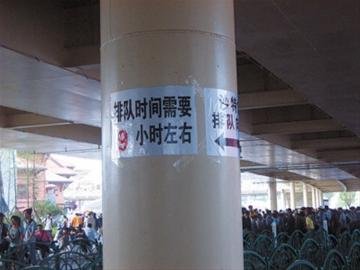 昨天上午10點許,記者在博成路上看到,一直備受游客青睞的沙特館隊伍等候時間再創新高,高架石柱上貼出“排隊時間需9小時”的提示牌。現場大約有100多名工作人員維持秩序,不停地用喇叭提醒參觀者排隊時間。