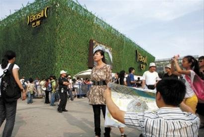 5日,巴西館外有趣一幕:看地圖的、看遠方的、拍照的,都想把世博會“看個明白”。