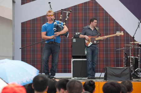 昨天下午歐洲廣場的演出中,斯凱里沃爾樂隊并沒有身著傳統的蘇格蘭短裙,而是穿著帆布鞋、牛仔褲,戴著墨鏡,抱著蘇格蘭風笛和搖滾吉他出場,因為此時他們的傳統服裝還被落在英國。這次演出并非一帆風順,出發前一場風暴襲擊英國,樂隊沒能趕上預定的飛機。