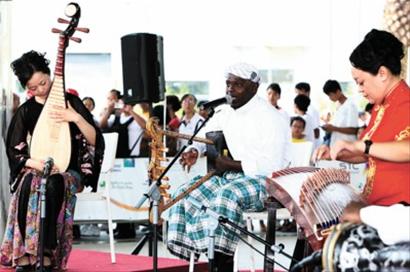 中國的琵琶、古箏與沙特的烏德琴、阿拉伯鼓合奏出現在世博園。從昨天中午12點開始,每隔兩個小時,中沙兩國藝術家在沙特館合作演出,慶祝兩國建交20周年。