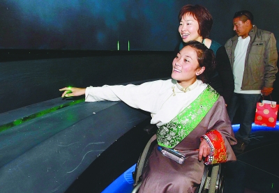 5月10日,來自青海玉樹地震災(zāi)區(qū)的藏族女孩尼瑪措毛坐著輪椅,進(jìn)入生命陽光館。地震中,她的腳踝骨折,父母和姑姑也都受了傷。在展館,尼瑪措毛體驗(yàn)了高科技智能輔助器具,也感受到全社會對殘疾人的關(guān)愛,她的臉上不時露出笑容。她說:“殘疾人生活可以充滿陽光,可以不向命運(yùn)低頭!