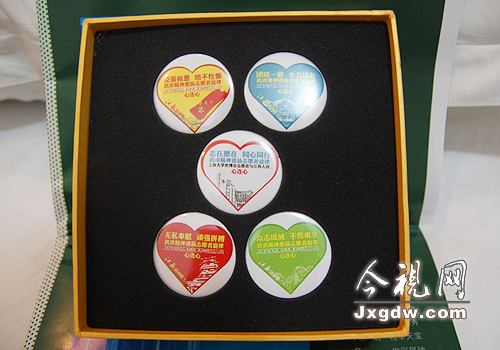 為了更好的配合江西活動周的開展,同時以抗洪精神更好的激勵志愿者做好世博服務,上海大學志愿者們親手設計了一套“同心”章,分別以江西井岡山、瑞金、滕王閣、三清山、上海大學圖書館為象征,發放給出席活動周開幕式的抗洪搶險英雄代表和嘉賓及游客。