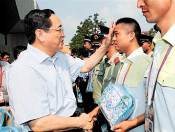 烈日下,俞正聲為世博園區服務保障人員拭去額頭的汗水。記者 周寅杰 攝