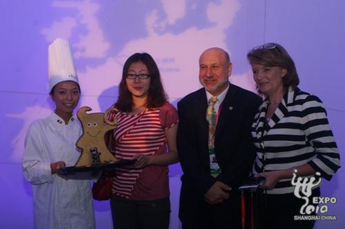 10月16日,當天世博園參觀者超過100萬人次之際,2010年上海世博會比利時-歐盟館迎來了一位特殊的客人——第600萬名游客。館長高美麗親自歡迎陳娟并陪同參觀,比利時歐盟展館鉆石展廊還向她贈送了一份比利時館的精美鉆飾。