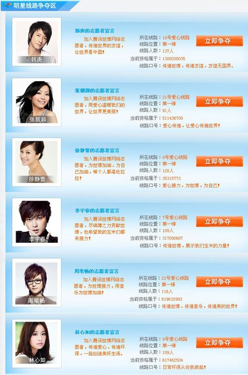 韓庚李宇春等眾多明星邀請網(wǎng)友加入世博網(wǎng)絡(luò)志愿者接力