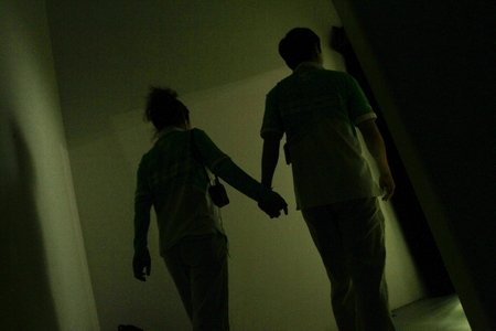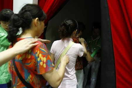 觀眾在謝丹玲的指引下,在黑暗的環(huán)境中體會盲人如何生活。