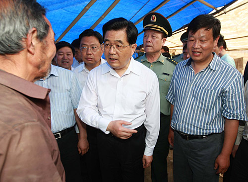 5月31日,中共中央總書記、國家主席、中央軍委主席胡錦濤前往陜西地震重災(zāi)區(qū)漢中市,察看災(zāi)情,指導(dǎo)抗震救災(zāi)工作。這是胡錦濤在寧強縣廣坪鎮(zhèn)金山寺村同受災(zāi)群眾親切交談。 新華社記者鞠鵬攝