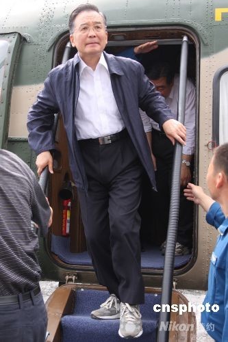 5月24日,中國總理溫家寶乘成都軍區(qū)陸航團的直升飛機抵達(dá)汶川大地震重災(zāi)區(qū)映秀鎮(zhèn),與聯(lián)合國秘書長潘基文會晤。中新社發(fā) 賈國榮 攝