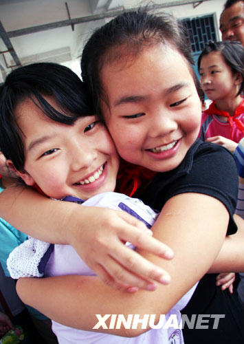5月24日,四川都江堰市太平街小學(xué)同班同學(xué)黃緣媛(右)和王文欣,在借讀學(xué)校重慶市云陽(yáng)縣實(shí)驗(yàn)小學(xué)重逢,高興地?fù)肀г谝黄。新華社發(fā)(饒國(guó)君攝)