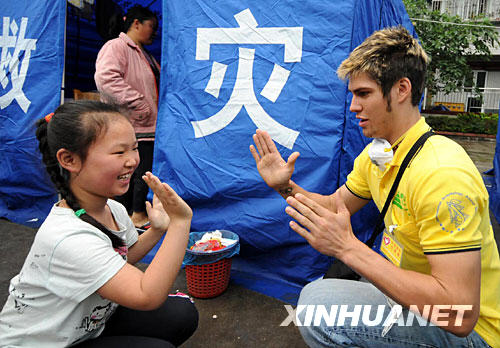 5月21日,一位來(lái)自美國(guó)的志愿者在四川什邡與受災(zāi)兒童做游戲。新華社記者 姜帆 攝