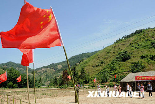 青川是大地震中受災(zāi)最嚴重的地區(qū)之一。地震發(fā)生后,青川縣專門購置了7500多面國旗,下發(fā)到每個安置點和每家每戶。到處飄揚的五星紅旗極大鼓舞了人們抗震救災(zāi)的士氣。 新華社記者 楊金志 攝