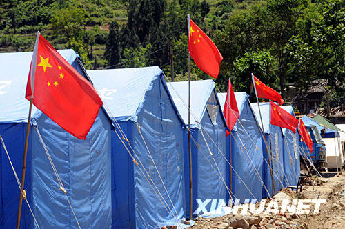 在四川青川縣板橋鄉(xiāng),救災(zāi)部隊幫助鄉(xiāng)里搭建了帳篷學(xué)校,學(xué)校周圍插滿了五星紅旗(6月2日攝)。
