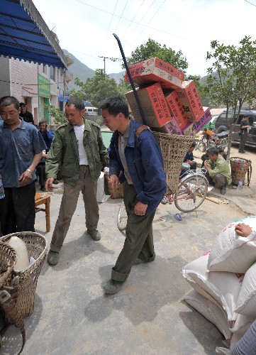 6月2日,北川縣曲山鎮楊柳坪村村民母賢清(左)領到了方便食品。目前,四川省抗震救災指揮部物資組對所有救災物資的運送、接收、分配、發放努力做到“三個一定”:一定要有賬,物資來源、數量、分配方向要登記造冊,做到有賬可查;一定要及時分配,不能積壓;一定要全程跟蹤,防止物資去向不明,保證全部用于受災群眾。新華社記者 宋振平 攝