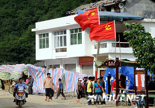 青川是大地震中受災(zāi)最嚴(yán)重的地區(qū)之一。地震發(fā)生后,青川縣專門購(gòu)置了7500多面國(guó)旗,下發(fā)到每個(gè)安置點(diǎn)和每家每戶。到處飄揚(yáng)的五星紅旗極大鼓舞了人們抗震救災(zāi)的士氣。 新華社記者 楊金志 攝