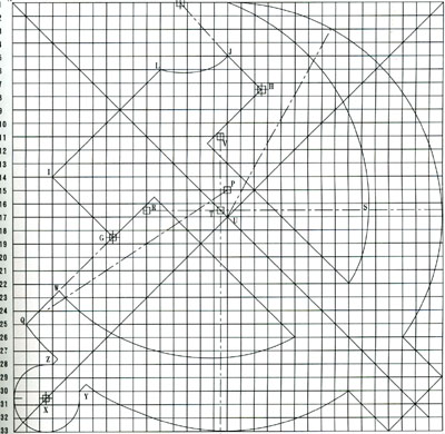 3  鐮刀的畫法:以M點(diǎn)(17、17′)為圓心、MN(N點(diǎn)為17、1′)為半徑畫弧⌒NO(O點(diǎn)為17、33′);以P點(diǎn)(17、15′)為圓心、PO為半徑畫弧,與HG的延長線交于Q點(diǎn);以R點(diǎn)(1116′、17′中點(diǎn))為圓心、RN為半徑畫弧,與通過R點(diǎn)的水平線交于S點(diǎn);以T點(diǎn)(16、1716′、17′的中點(diǎn))為圓心、TS為半徑畫弧,與通過T點(diǎn)的垂直線交于U點(diǎn);以V點(diǎn)(16、1711′中點(diǎn))為圓心、VU為半徑畫弧,與HG的延長線交于W,構(gòu)成鐮刀。以X點(diǎn)(3、4  30′、31′的中點(diǎn))為圓心作圓與AB、BC線相切,從Y點(diǎn)(6、30′)、Z點(diǎn)(4、28′)分別作直線平行于BD,構(gòu)成鐮刀把。