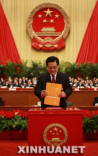 3月15日,十一屆全國人大一次會議在北京人民大會堂舉行第五次全體會議,選舉第十一屆全國人民代表大會常務(wù)委員會委員長、副委員長、秘書長;選舉第十一屆全國人民代表大會常務(wù)委員會委員;選舉中華人民共和國主席、副主席;選舉中華人民共和國中央軍事委員會主席。這是胡錦濤在投票。 新華社記者鞠鵬攝 (組圖)