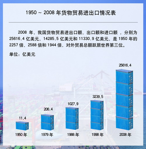 1950年我國進出口僅有11.3億美元,2008年達到25631億美元,增長2267倍,年均增長14.2%,是1949-1978年30年總和的15倍。進出口總額占世界貿易總額的比重,由1950年的0.9%上升至2008年的8.86%,成為世界第三大貿易國和第二大出口國。解放初期,我國從事對外貿易的企業(yè)只有10多家,到2008年底已經達到75萬家。經過60年的發(fā)展,目前我國成為名副其實的貿易大國。