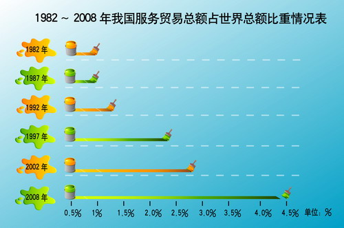 1982~2008年我國服務貿易總額占世界總額比重情況表.服務貿易進出口總額從1982年的43.4億美元增長到2008年的3044.5億美元,26年間增長了近70倍,年均增速比世界同期高約9個百分點。