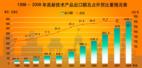 1998~2008年高新技術產品出口額及占外貿比重情況表。1999年實施“科技興貿”戰(zhàn)略以來,高新技術產品出口發(fā)展迅速,比重提高,其中具有自主知識產權和自由品牌的出口產品有了很大增長。