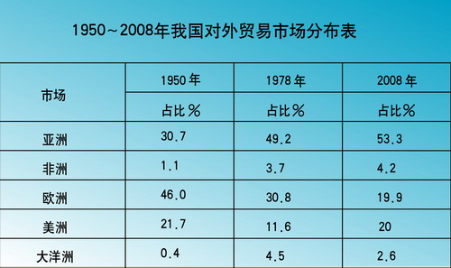 1950~2008年我國對外貿易市場分布表。在貿易規(guī)模不斷擴大的同時,我國積極發(fā)展同世界各個國家和地區(qū)的貿易關系,貿易伙伴已經發(fā)展到2008年的220多個國家和地區(qū)。