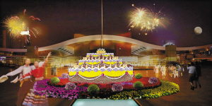 百姓最為關注的市民中心,擺花主題為普天同慶,位置在市民中心南側的市民廣場。設計時取蛋糕日常生活中慶祝節日的事物,用鮮花和絹花布置一個長12米、高5.5米巨型蛋糕,拼出“深圳30周年”字樣。周邊由園林材料布景成點燃的30支蠟燭,表達對深圳經濟特區30歲生日的祝福,同時結合光電技術,使夜晚延續白天的歡樂氛圍。
