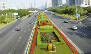 此外,深南路田面到僑城東中間綠化帶,將采用節點、線性景觀相結合的形式進行擺花造景。線性景觀就是在中間綠化帶上有規律地栽培花卉,按相應的距離增加種植造型球和充氣球。節點景觀在綠化帶中人行路口及十字路口兩則布置立體花壇和地栽擺花造景,景點主題為熱烈、迎賓、歷程。