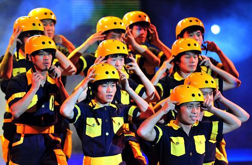 4月22日,來(lái)自深圳市寶安區(qū)總工會(huì)的演員在文藝晚會(huì)上表演《快樂(lè)的建筑工》。