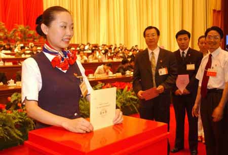 7月24日,來自中國東方航空西北公司的“全國青年文明號”乘務長朱喆在北京人民大會堂舉行的中國共產主義青年團第十五次全國代表大會第二次全體大會上投票。當日,出席共青團十五大的1500多名青年代表以無記名投票方式選舉產生了中國共產主義青年團第十五屆中央委員會。新華社記者袁滿攝