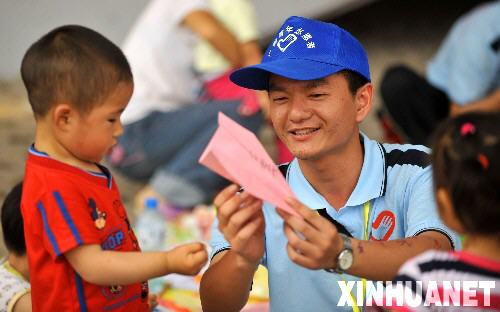5月28日,一名來自廣西的青年志愿者在綿陽九洲體育館外與孩子做游戲。 在四川綿陽九洲體育館受災群眾安置點,來自全國各地的100多名志愿者經常陪伴在災區兒童身旁,通過繪畫、游戲等心理援助手段,使孩子們幼小的心靈能夠盡快擺脫災難的陰影。 新華社記者 郝同前攝