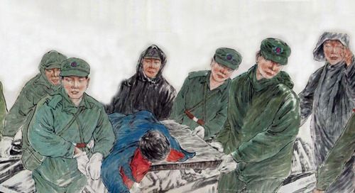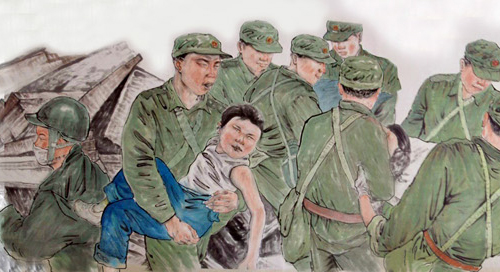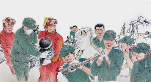 這幅被命名為《振起豐碑》的國畫人物長卷,高1米多,長100多米,裱好后的重量達30多公斤,畫卷中的人物多達600多名,有領導人親臨一線指揮救災的情景,有解放軍官兵奮力救災的情景,有醫務人員冒險救死扶傷的場面,還有從廢墟中被救出的人們,感嘆劫后余生的場景。
